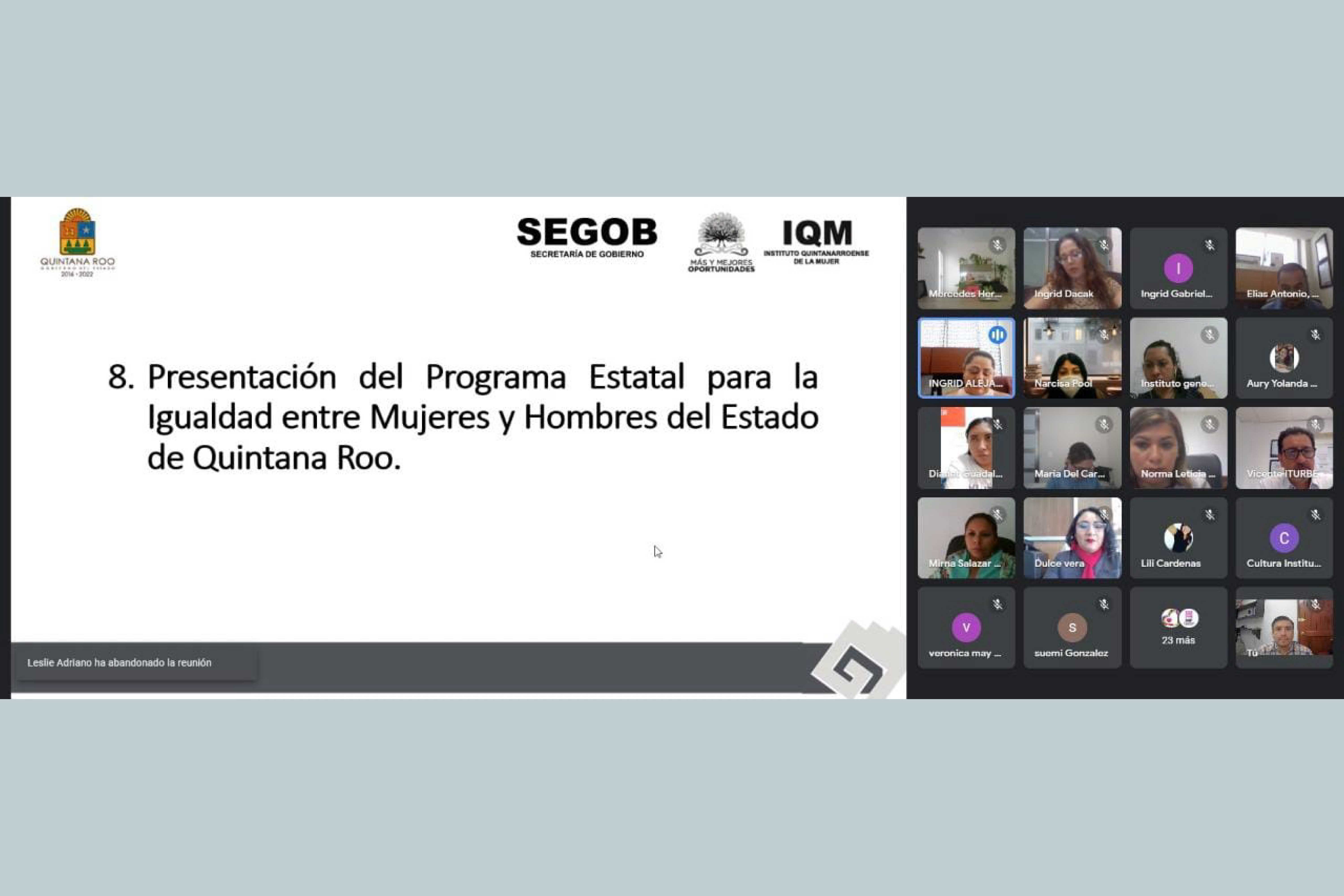 De igual manera, se presentó el Programa Estatal para la Igualdad entre Mujeres y Hombres del Estado de Quintana Roo; además de aprobar el Informe correspondiente al Segundo Trimestre del Sistema Estatal de Igualdad entre Hombres y Mujeres y el Estatus de Instituciones que conforman el Programa Quintanarroense de Cultura Institucional correspondiente al Segundo Trimestre del ejercicio 2022.