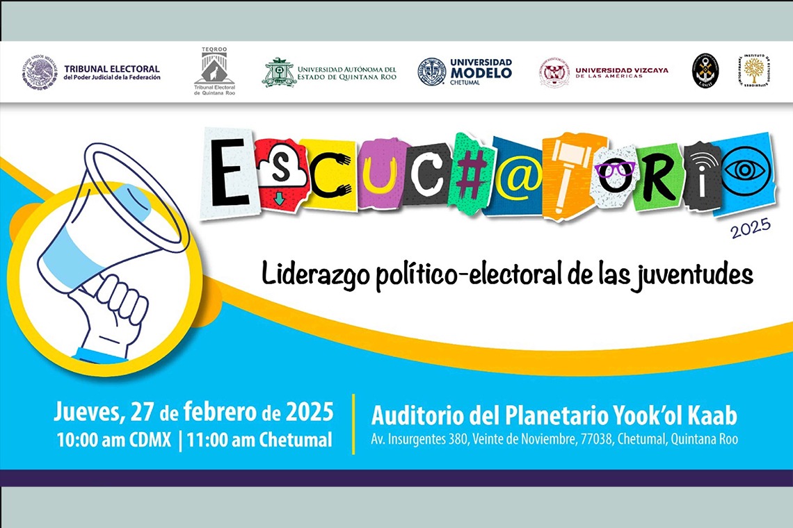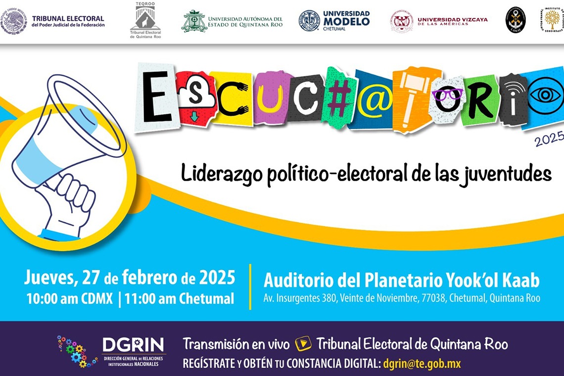 Chetumal, Quintana Roo a 20 de febrero de 2025. - El Tribunal Electoral de Quintana Roo (TEQROO) y la Sala Superior del Tribunal Electoral del Poder Judicial de la Federación (TEPJF), tienen programado realizar el próximo 27 de febrero, el Escuchatorio “Liderazgo político-electoral de las juventudes”, espacio donde las y los estudiantes universitarios expresaran sus principales inquietudes, intereses y propuestas sobre la vida política-electoral, democrática y social del país.