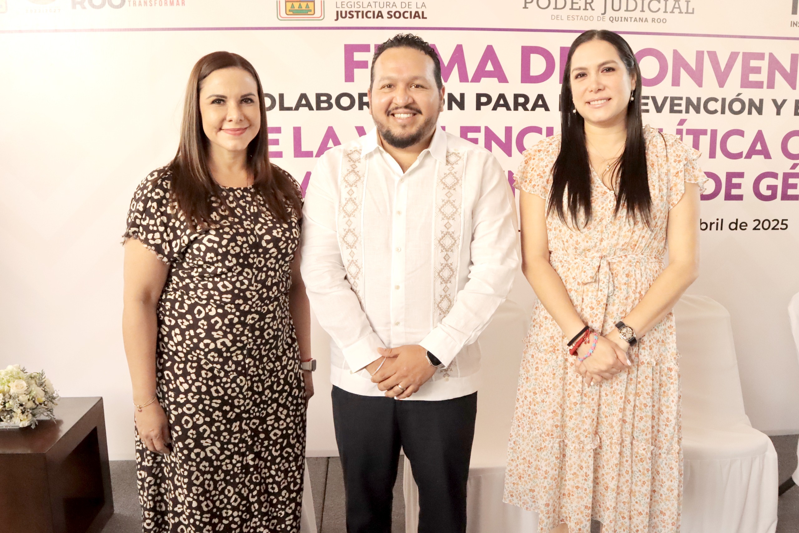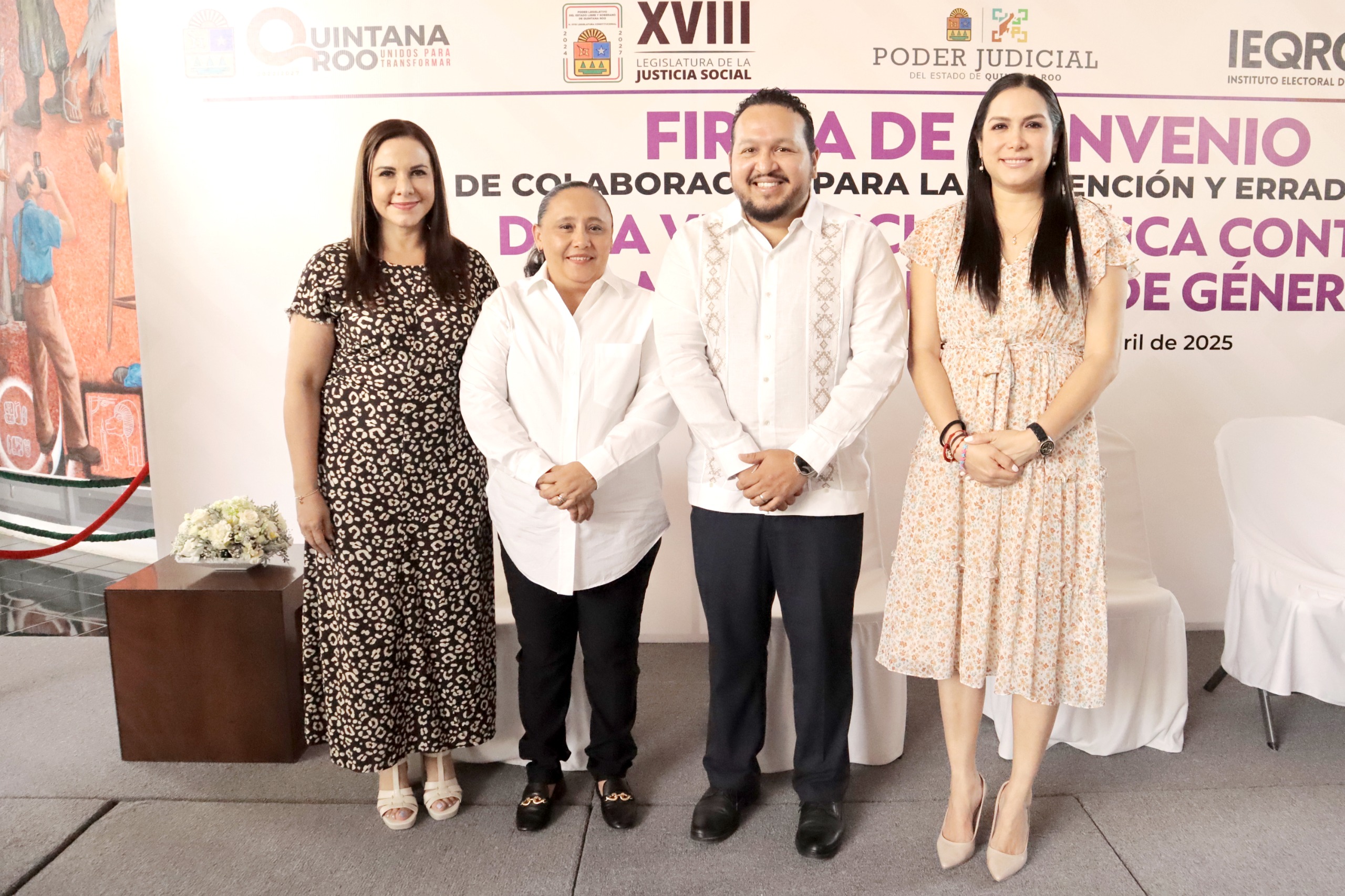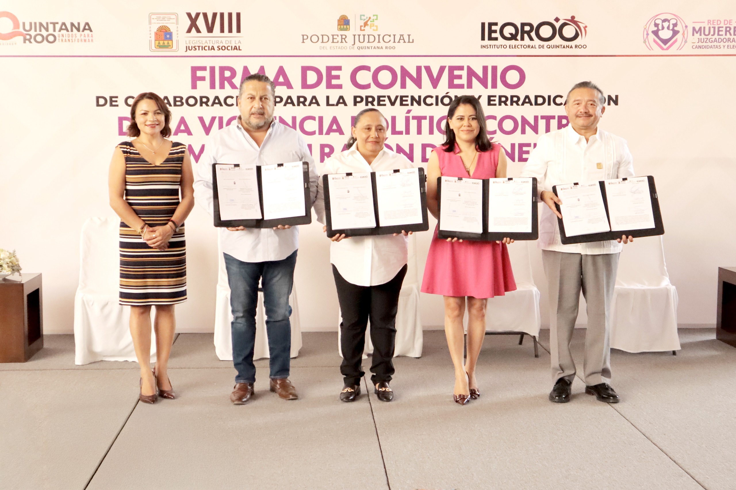 El evento tuvo lugar en el vestíbulo del Congreso del Estado, donde suscribieron dicho convenio la Secretaria de Gobierno, María Cristina Torres Gómez; el Presidente de la Junta de Gobierno y Coordinación Política de la XVIII Legislatura del Congreso del Estado, Jorge Arturo Sanén Cervantes; el Magistrado del Tribunal Superior de Justicia del Estado y Director de la Escuela Judicial, Ángel Ysidro Quintal Quintal y la Consejera Presidenta del Instituto Electoral de Quintana Roo, Rubí Pacheco Pérez.