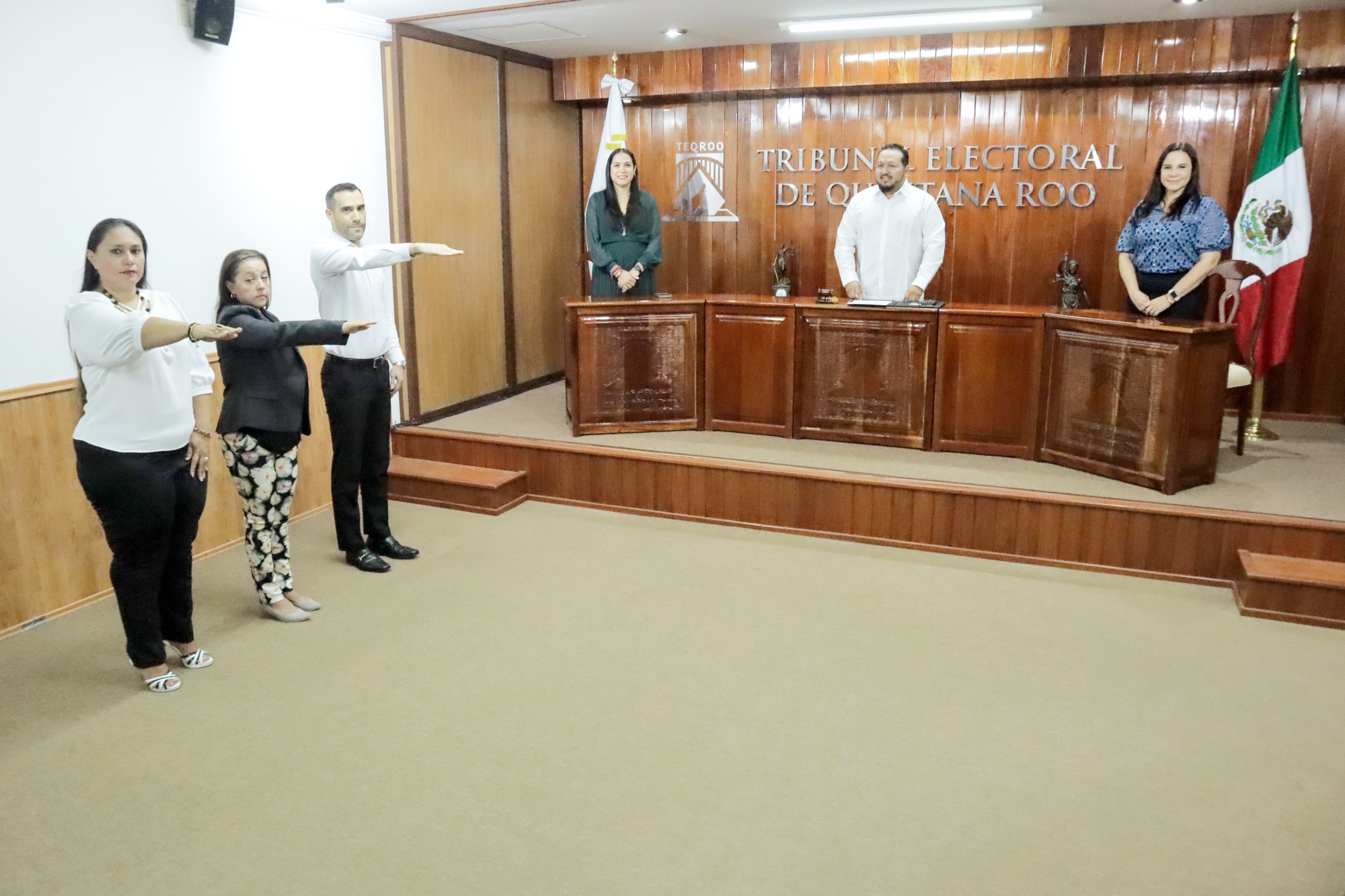 Chetumal, Quintana Roo a 04 de junio de 2025.- El Magistrado Presidente del Tribunal Electoral de Quintana Roo (TEQROO), Sergio Avilés Demeneghi y las Magistradas Claudia Ávila Graham y Thalía Hernández Robledo presenciaron la toma de protesta de ley del personal que estará asignado al Órgano Interno de Control (OIC), a Ponencia y a la Unidad de Capacitación e Investigación.