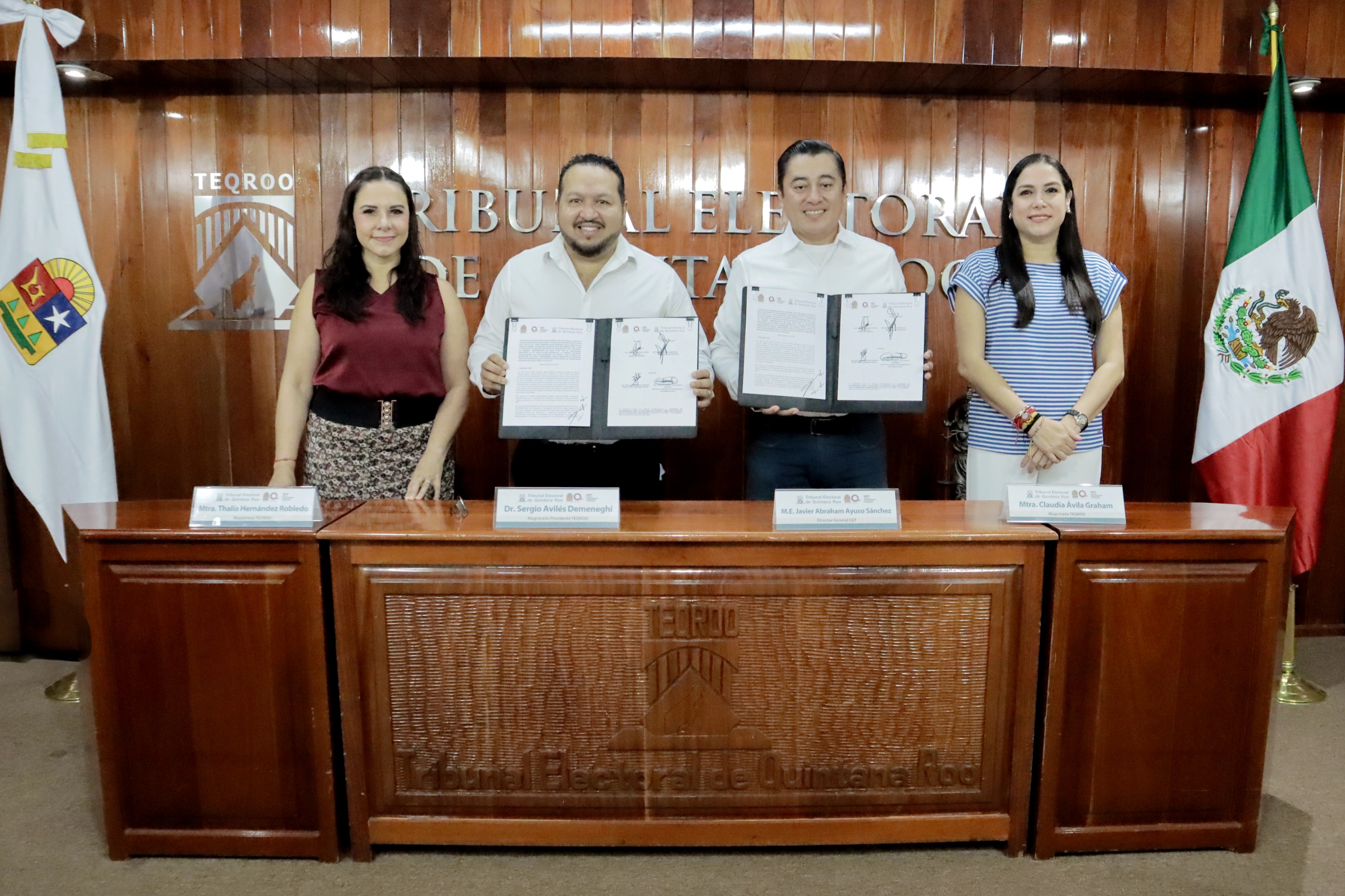 El convenio fue suscrito por el Magistrado Presidente del TEQROO, Sergio Avilés Demeneghi, y el Director General del IQIT, Javier Abraham Ayuso Sánchez, en una ceremonia celebrada en el Aula del Centro de Capacitación e Investigación Electoral del Tribunal. Al acto asistieron también las magistradas Claudia Ávila Graham y Thalía Hernández Robledo, así como personal directivo de ambas instituciones.