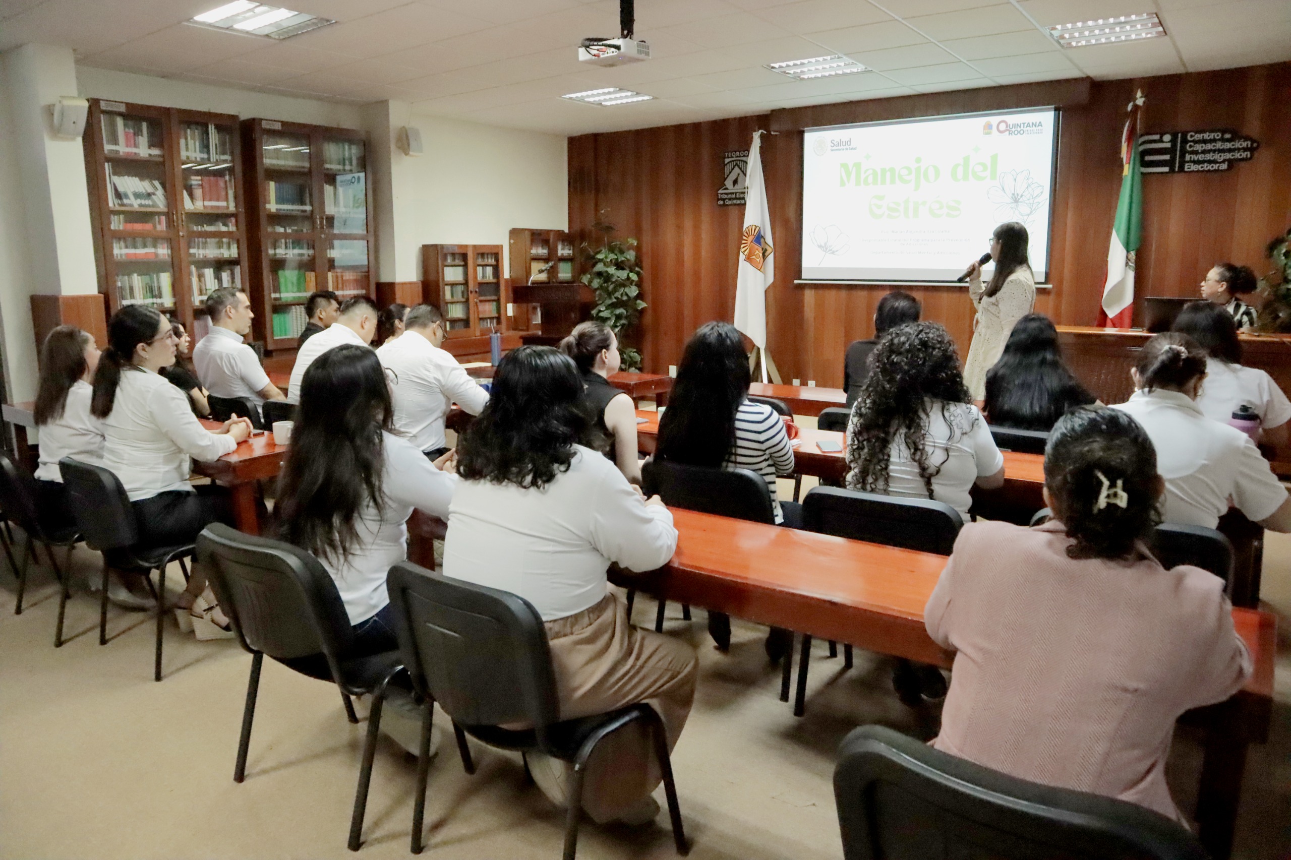 La capacitación, realizada en el Aula del Centro de Capacitación e Investigación Electoral, estuvo a cargo de Marian Alejandra Itzá Lizama, responsable del Programa para la Prevención de Adicciones, quien inició con el tema “Manejo del estrés”.