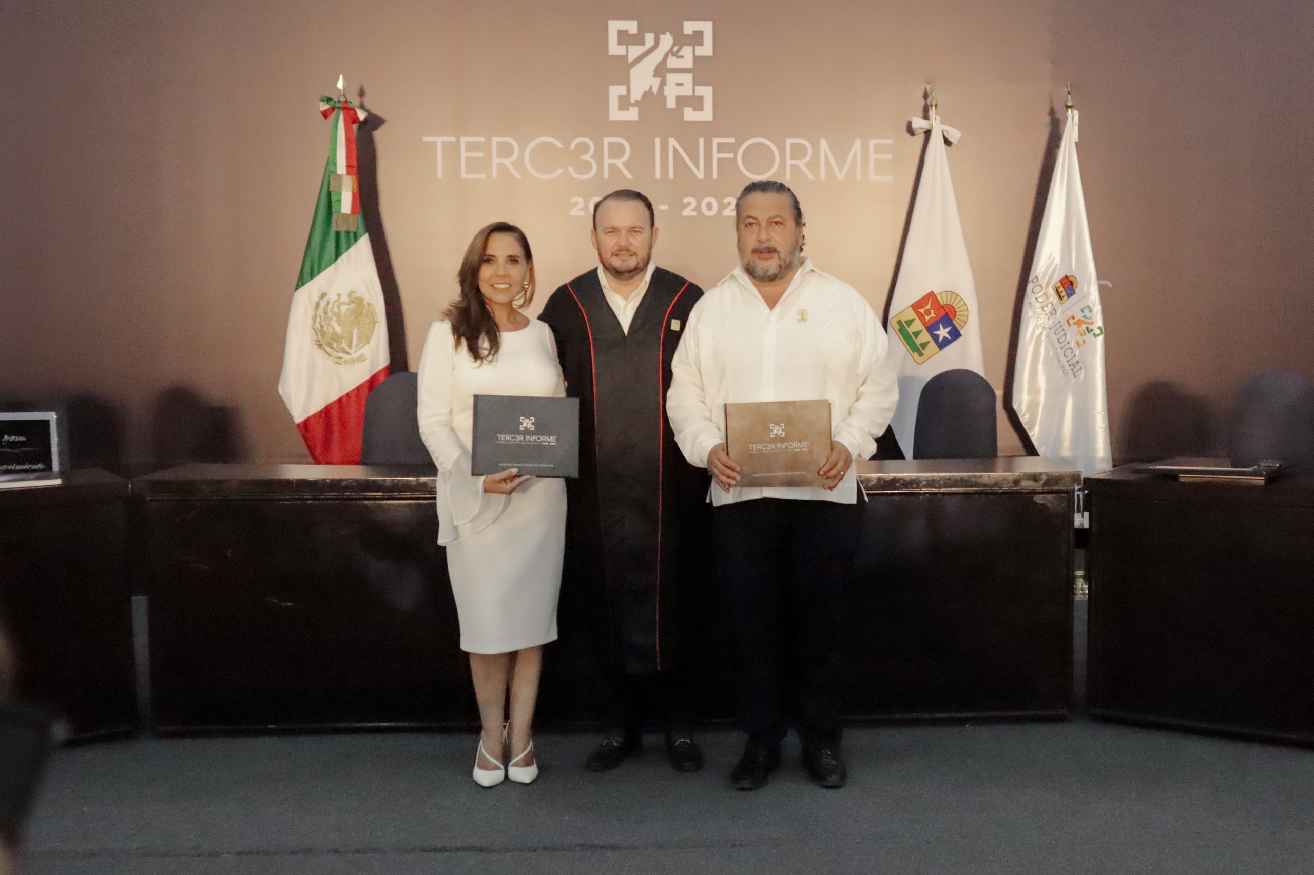 Chetumal, Quintana Roo, a 29 de agosto de 2025.- El Magistrado Presidente del Tribunal Electoral de Quintana Roo (TEQROO), Sergio Avilés Demeneghi, junto con las Magistradas Claudia Ávila Graham y Thalía Hernández Robledo, participaron en el Tercer Informe de Actividades del Magistrado Presidente del Tribunal Superior de Justicia del Estado de Quintana Roo, Heyden José Cebada Rivas, acto que fue encabezado por la Gobernadora del Estado, Mara Lezama Espinosa.