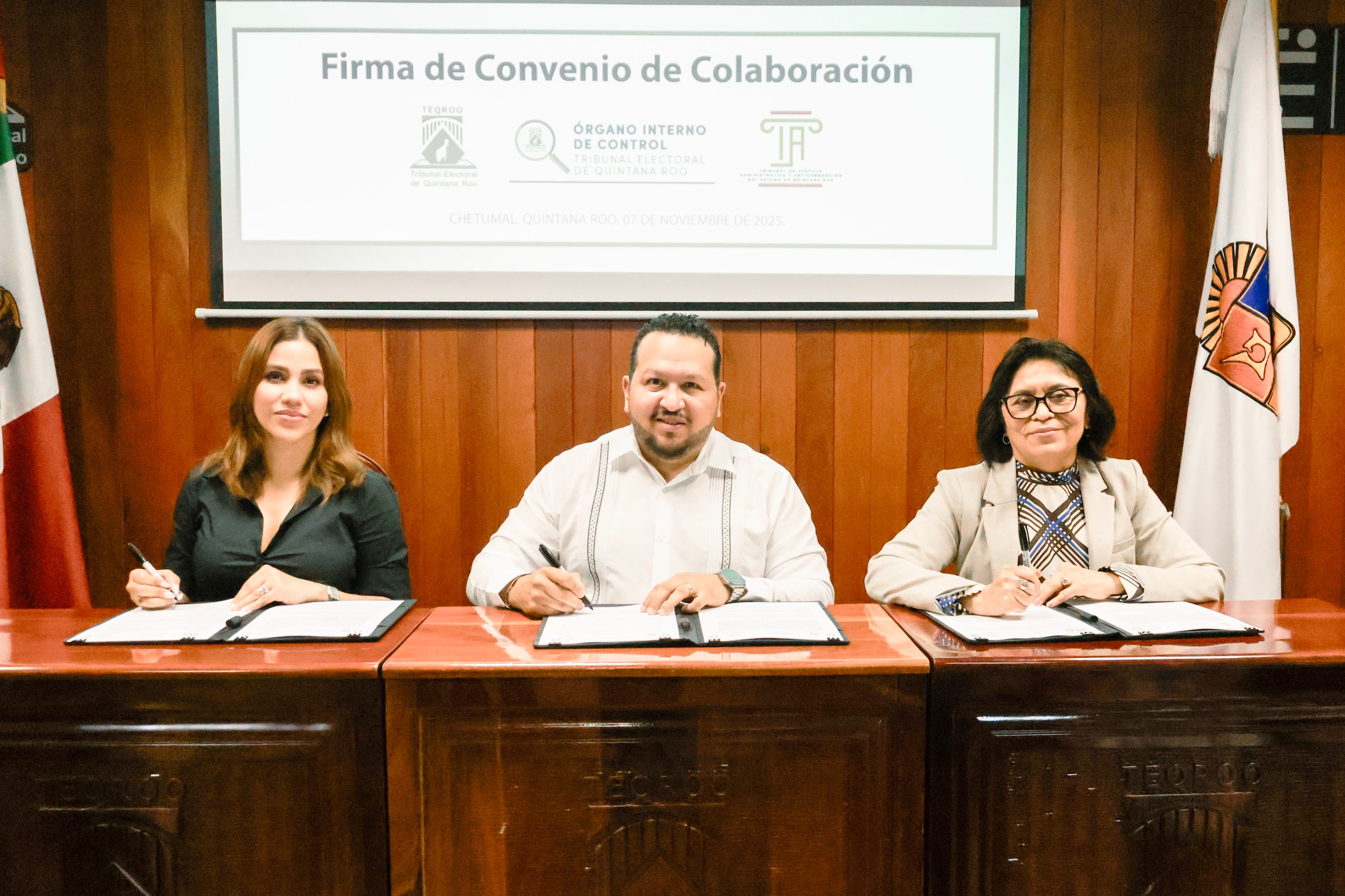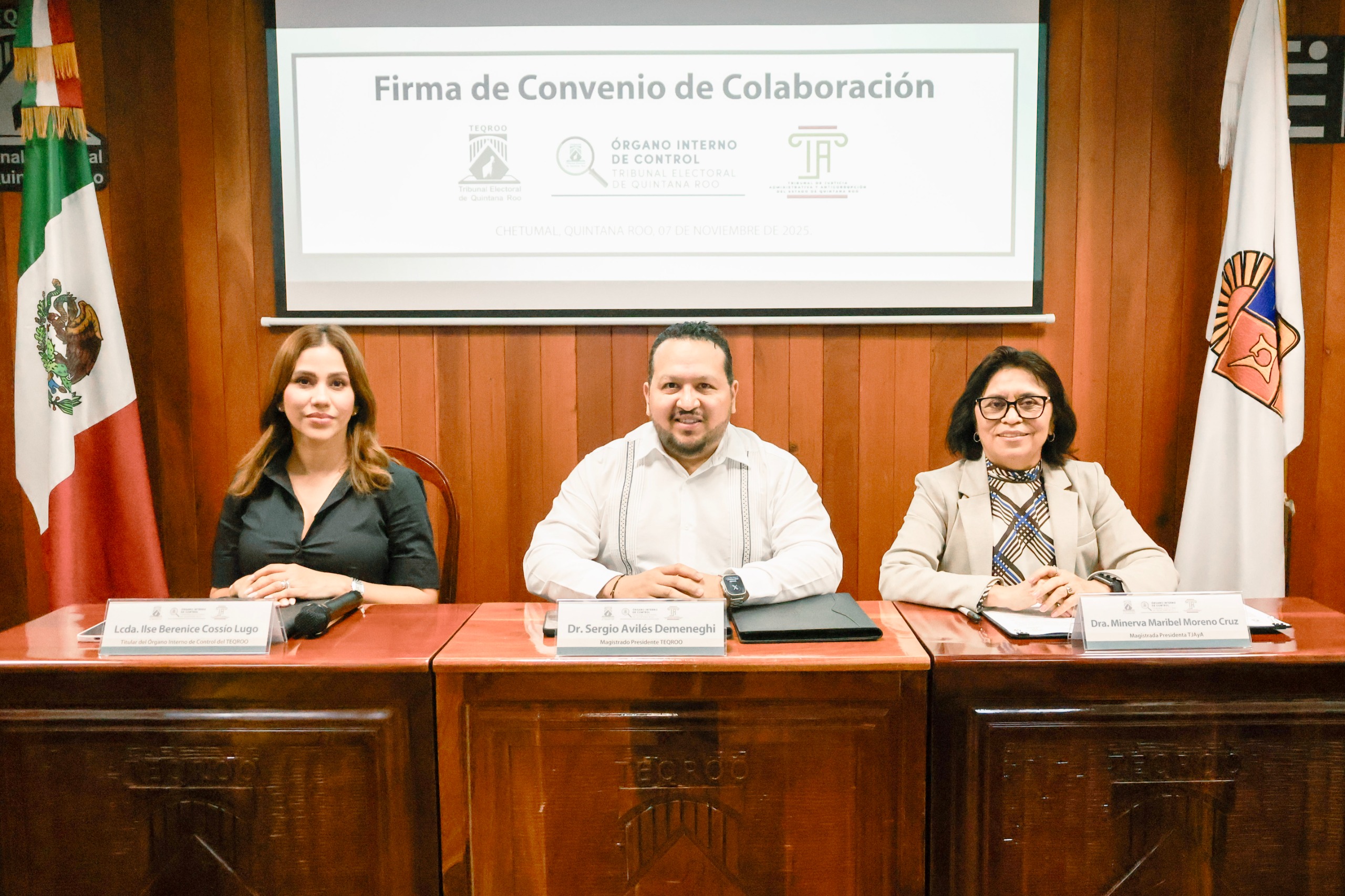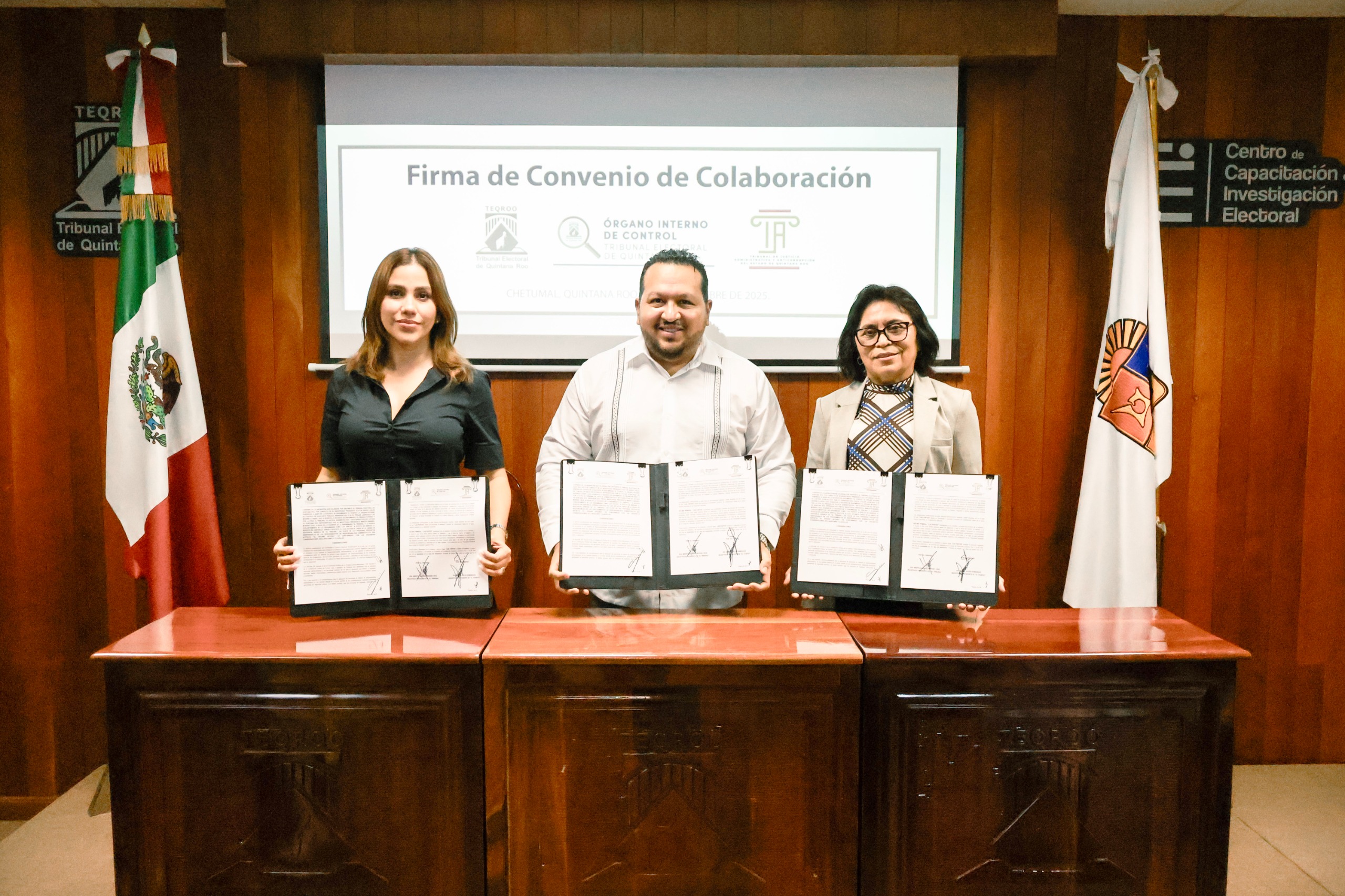Firmaron este convenio, el Magistrado Presidente del TEQROO, Sergio Avilés Demeneghi; la Magistrada Presidenta del TJAAQROO, Minerva Maribel Moreno Cruz y la Titular del Órgano Interno de Control de este órgano jurisdiccional, Ilse Berenice Cossío Lugo.