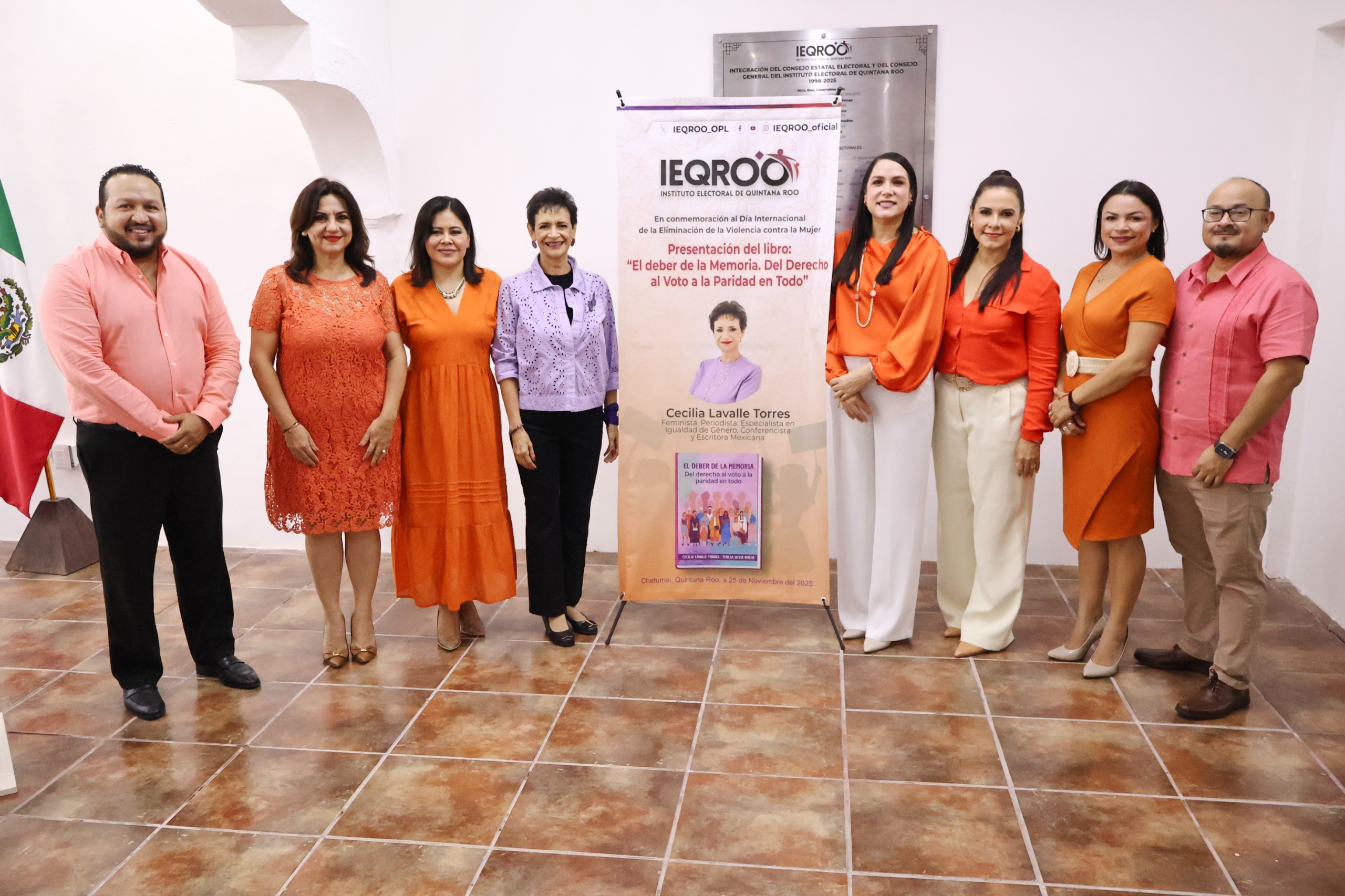 Chetumal, Quintana Roo, a 25 de noviembre de 2025.- El Magistrado Presidente del Tribunal Electoral de Quintana Roo (TEQROO), Sergio Avilés Demeneghi, junto con las Magistradas Claudia Ávila Graham y Thalía Hernández Robledo, asistieron a la presentación del libro “El deber de la memoria. Del derecho al voto a la paridad en todo”, en el marco de la conmemoración del Día Internacional de la Eliminación de la Violencia contra la Mujer.
