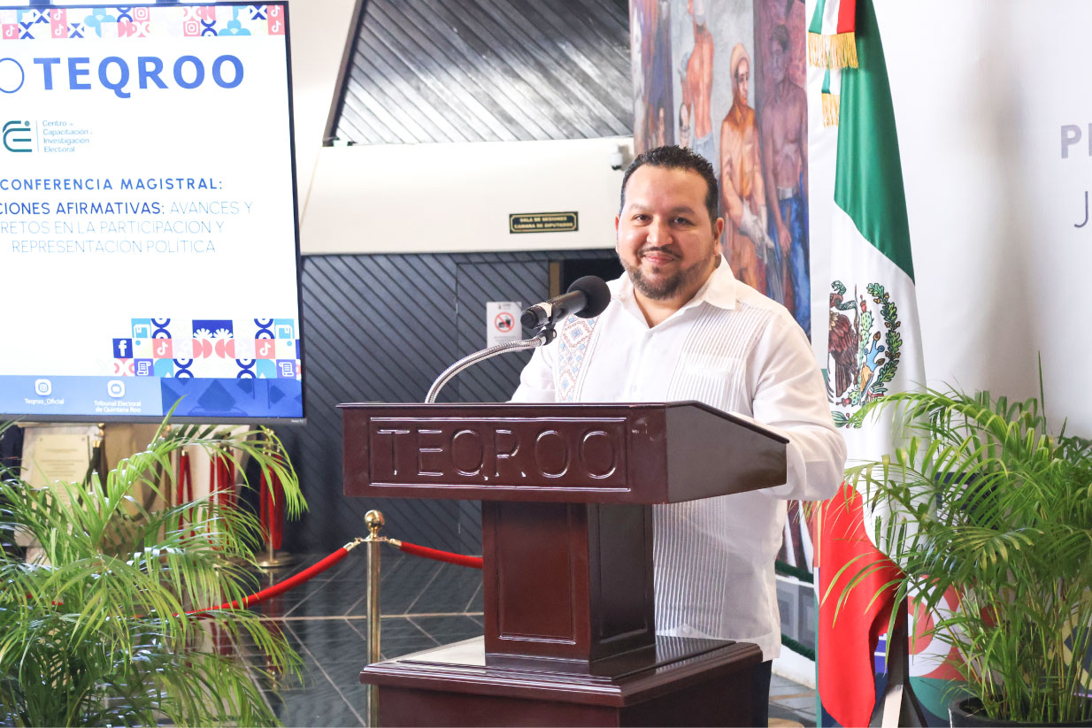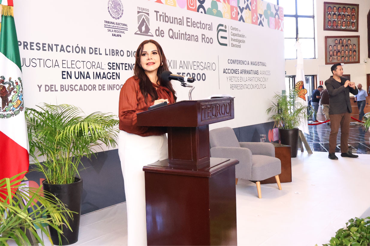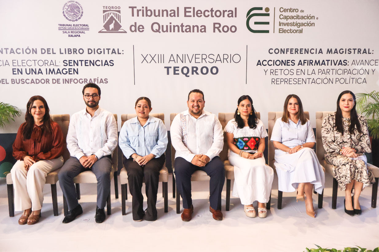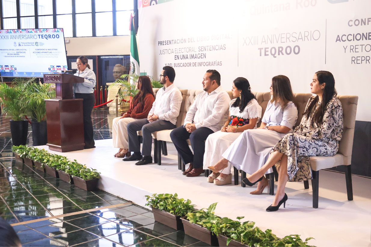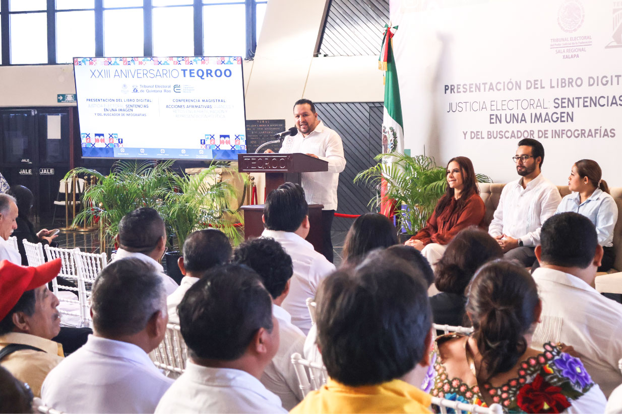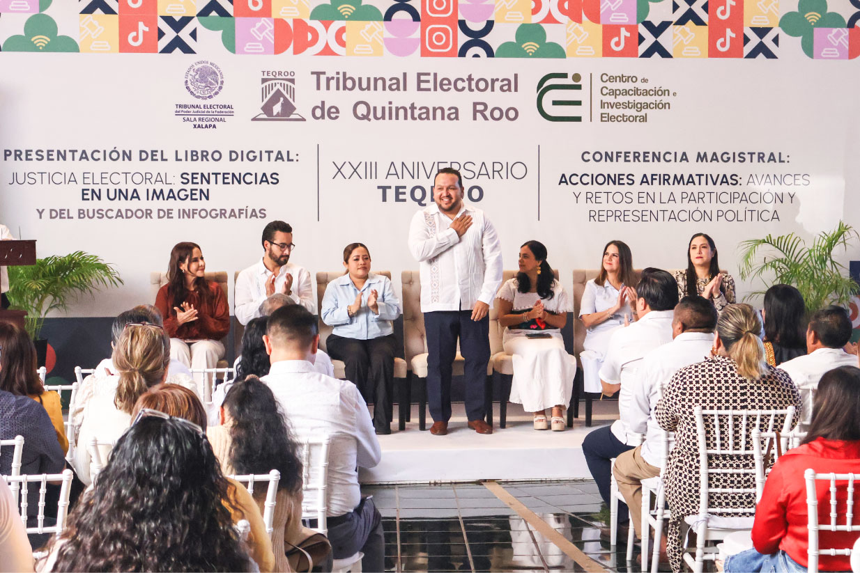 Chetumal, Quintana Roo, a 30 de enero de 2026.- El Tribunal Electoral de Quintana Roo (TEQROO) conmemoró su XXIII Aniversario con una ceremonia en la que se presentó el libro digital “Justicia Electoral: Sentencias en una Imagen” y su Buscador de Infografías, así como la Conferencia Magistral “Acciones afirmativas: avances y retos en la participación y representación política”, a cargo de Roselia Bustillo Marín, Magistrada Presidenta de la Sala Regional Xalapa del Tribunal Electoral del Poder Judicial de la Federación (TEPJF).