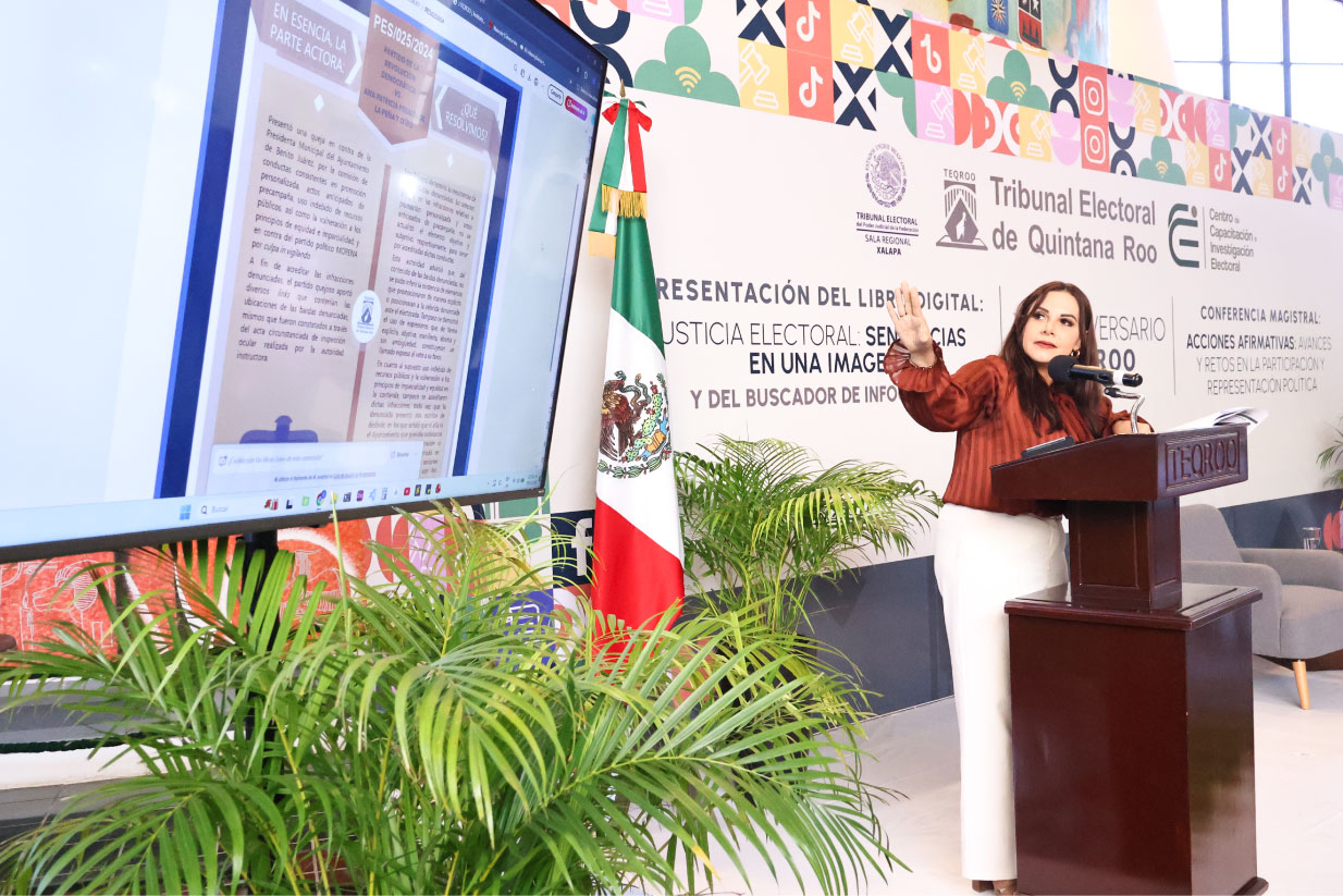 Asimismo, subrayó los retos actuales de la justicia electoral, en particular la implementación de acciones afirmativas que garanticen una participación política más incluyente, y resaltó la relevancia de iniciativas como el libro digital “Justicia Electoral: Sentencias en una Imagen” y su Buscador de Infografías, al considerarlas herramientas que fortalecen la transparencia, la justicia abierta y el acercamiento de la labor jurisdiccional a la ciudadanía.