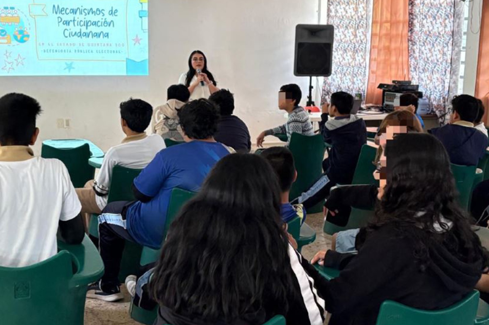 Chetumal, Quintana Roo, a 04 de febrero de 2026.– Personal de la Defensoría Pública Electoral del Estado de Quintana Roo impartió la plática titulada “Mecanismos de participación ciudadana” al alumnado de segundo grado, grupos “A” y “B”, de la Escuela Secundaria David Alfaro Siqueiros, en esa actividad la Defensora Pública Electoral, Mtra. Estefanía Carolina Caballero Vanegas, fue la encargada de impartir la plática.