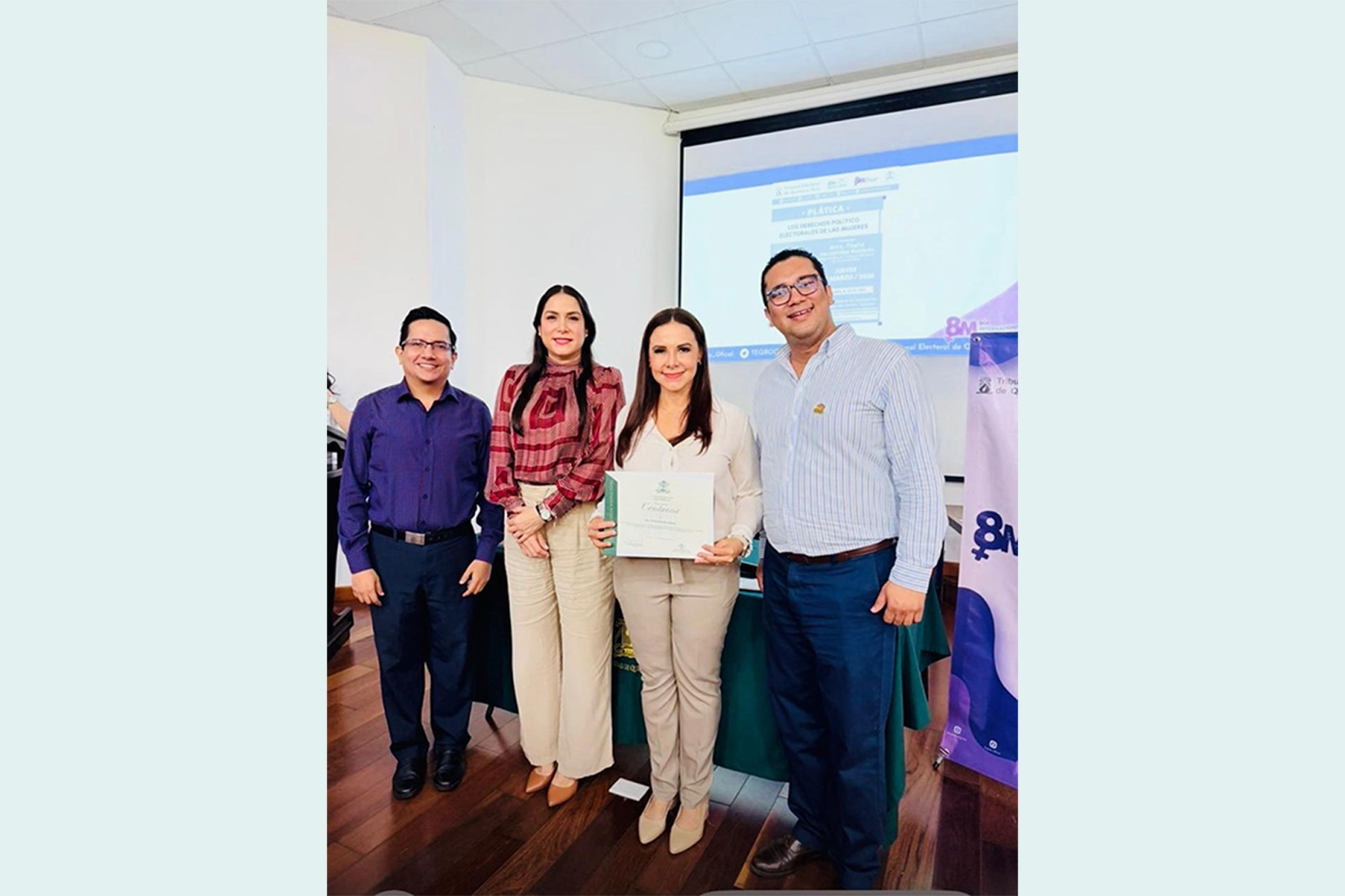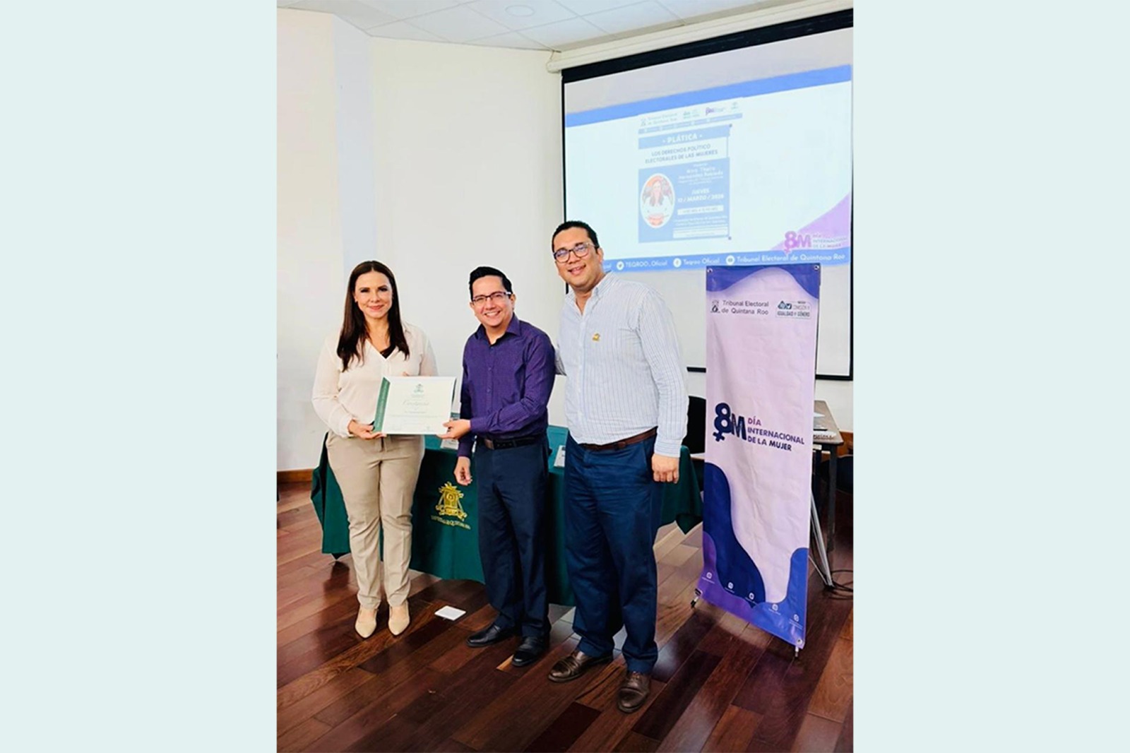 La plática fue organizada por el Tribunal Electoral de Quintana Roo, a través de la Comisión de Igualdad de Género, como parte de las acciones conmemorativas del Día Internacional de la Mujer. Al finalizar el evento, la institución educativa entregó un reconocimiento a la magistrada Thalía Hernández Robledo por su participación y aportación académica.