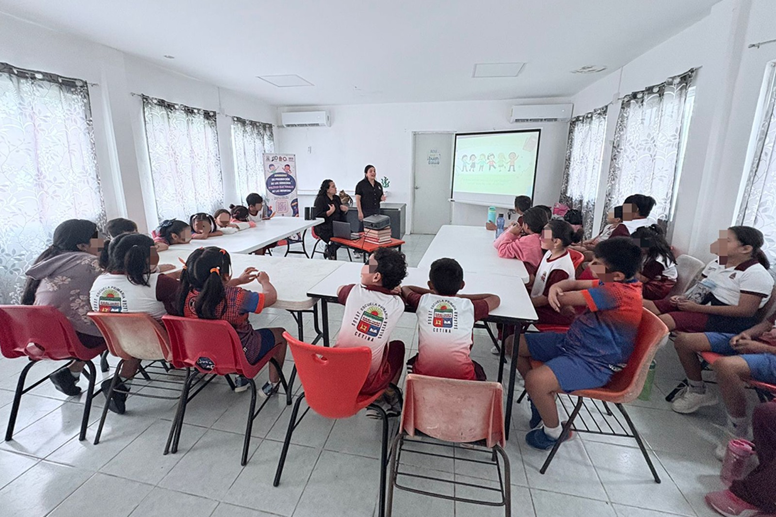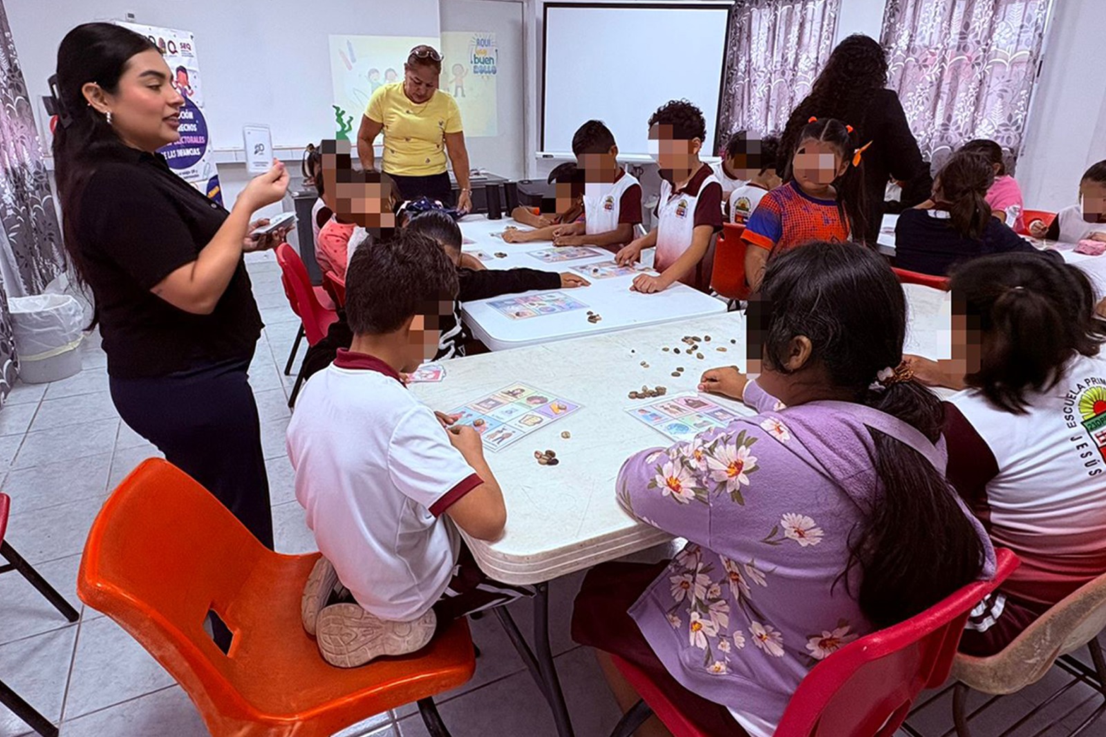 Posteriormente, el 22 de abril, la misma plática fue dirigida a estudiantes de cuarto grado por parte de Anahí Aragón Serrano, titular de la Defensoría Pública Electoral, en el marco de la conmemoración del Día de la Niña y el Niño, a través de una metodología accesible y participativa, que incluyó materiales audiovisuales y actividades lúdicas como el juego de la lotería, se promovieron valores como la participación, la igualdad y el respeto en la vida democrática.