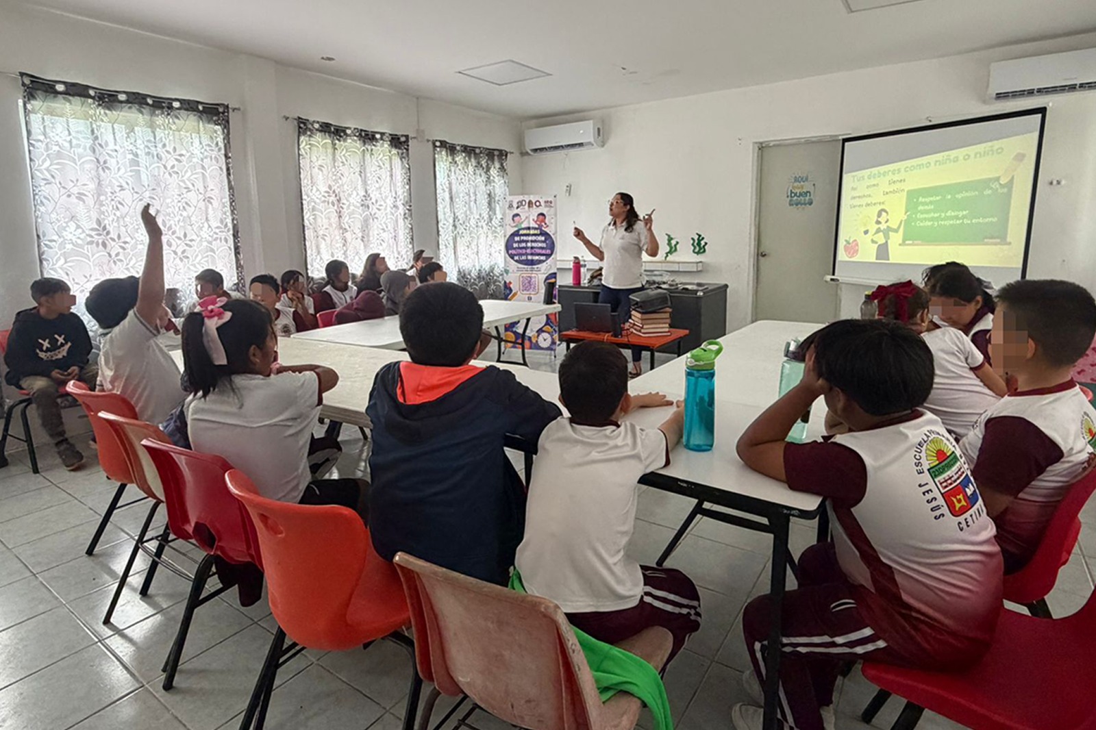 Chetumal, Quintana Roo, a 22 de abril de 2026.- En el marco de las Jornadas de promoción de los derechos político-electorales de las infancias, personal de la Defensoría Pública Electoral del Tribunal Electoral de Quintana Roo (TEQROO) llevó a cabo diversas actividades dirigidas a estudiantes de la Escuela Primaria Jesús Cetina Salazar.