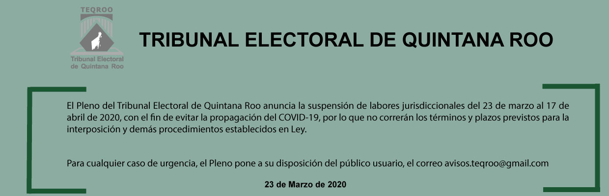 Chetumal, Quintana Roo a 23 de marzo de 2020.- El Pleno del Tribunal Electoral de Quintana Roo firmó hoy un acuerdo para aprobar la suspensión de la atención al público y la función jurisdiccional de este Tribunal, así como las actividades de capacitación, cursos, uso de biblioteca, y demás diligencias administrativas, por el período comprendido del 23 de marzo al 17 de abril de 2020.
