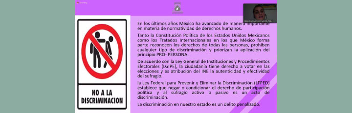 Ante alumnas y alumnos de la UNID, afirmó que corresponde al Instituto Nacional Electoral y a los organismos públicos locales salvaguardar el ejercicio efectivo de los derechos político electorales y promover el cumplimiento de las obligaciones de la ciudadanía, reconociendo que existen aún prejuicios sociales que permean en la sociedad y en los poderes públicos, los cuales generan prácticas discriminatorias directas e indirectas hacia este grupo de población.
