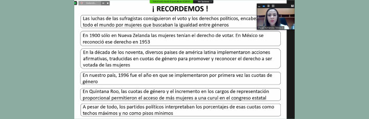 Chetumal, Quintana Roo a 06 de julio de 2020.- El Tribunal Electoral de Quintana Roo impartió un webinar a trabajadoras y trabajadores del Municipio de Puerto Morelos sobre “Mujeres en la lucha por la igualdad política”, el cual estuvo a cargo de la Consejera del Instituto Electoral de Quintana Roo, Thalía Hernández Robledo, como ponente invitada.