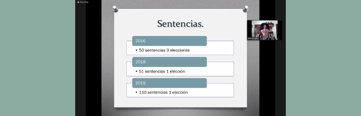 En esta conferencia virtual, la Magistrada hizo un recuento del origen y desarrollo del Procedimiento Especial Sancionador a través de reformas constitucionales y legales hasta como se encuentra en la actualidad y los retos que enfrenta.