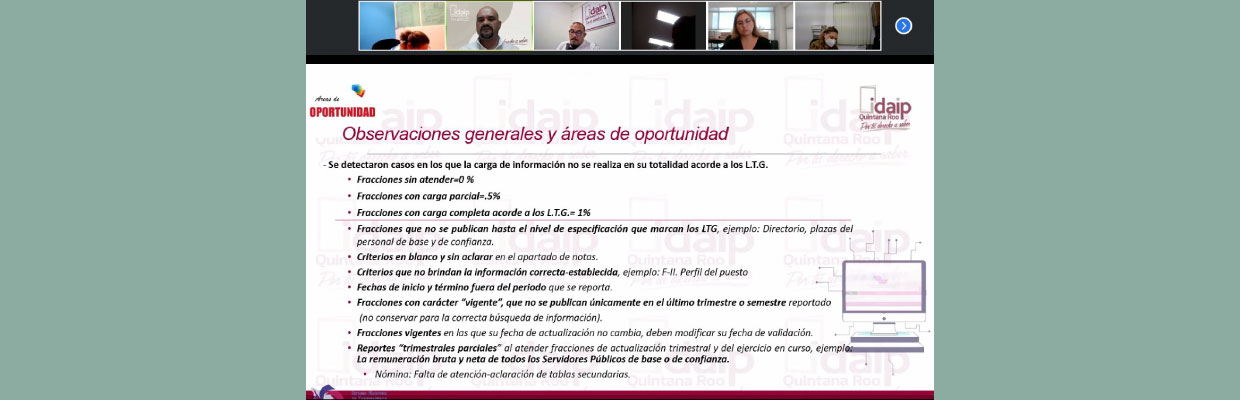 La reunión estuvo presidida por el Coordinador de Vinculación del IDAIPQROO, Juan Carlos Chávez, quien informó sobre los resultados y observaciones generales de la verificación virtual oficiosa no vinculante sobre el ejercicio 2020, con el fin de subsanar inconsistencias y mejorar resultados en cumplimiento a Obligaciones de Transparencia.