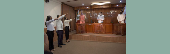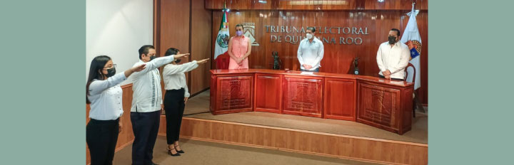 Chetumal, Q. Roo a 17 de noviembre de 2021.- Ante la magistrada y los magistrados integrantes del Pleno del Tribunal Electoral de Quintana Roo, Erick Alejandro Villanueva Ramírez y Carla Adriana Mingüer Marqueda, rindieron protesta como Secretario de Estudio y Cuenta y Secretaria Auxiliar de Estudio y Cuenta, respectivamente; así como María Eugenia Hernández Lara, como Auxiliar Administrativo.