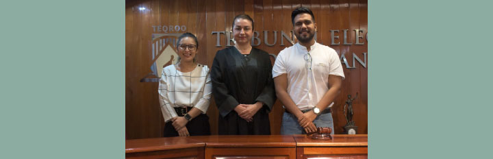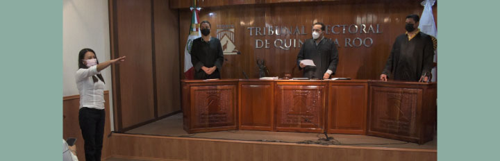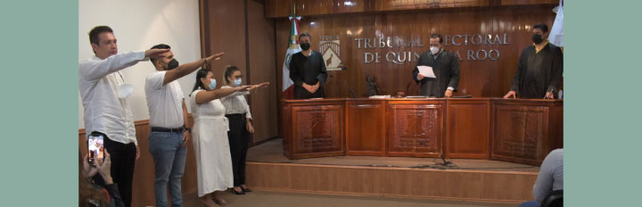Chetumal, Quintana Roo a 17 de febrero de 2022.- El Magistrado Presidente del Tribunal Electoral de Quintana Roo, Sergio Avilés Demeneghi, la Magistrada Claudia Carrillo Gasca y el Magistrado Víctor Vivas Vivas presidieron la toma de protesta de la Secretaría Técnica de la Presidencia, Maogany Crystel Acopa Contreras y a cuatro del personal jurídico eventual que estará laborando durante el Proceso Electoral Local Ordinario 2022.
