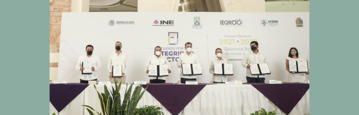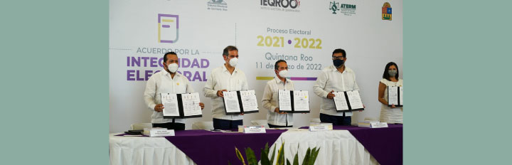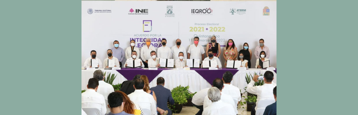 Chetumal, Quintana Roo a 11 de marzo de 2022.- Asumir responsabilidades sociales y cívicas para la organización y el desarrollo de un proceso electoral íntegro en Quintana Roo es el compromiso que establecieron el Tribunal Electoral del Poder Judicial de la Federación (TEPJF), el Instituto Nacional Electoral (INE), el Tribunal Electoral de Quintana Roo (TEQROO), el Instituto Electoral de Quintana Roo (IEQROO) y partidos políticos locales al firmar el Acuerdo por la Integridad Electoral del Proceso Electoral 2021-2022.