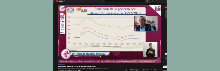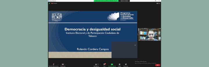 Chetumal, Quintana Roo a 27 de abril de 2022.- La Magistrada del Tribunal Electoral de Quintana Roo (TEQROO), Claudia Carrillo Gasca participó de manera virtual en la conferencia magistral “Democracia y Desigualdad Social”, que impartió Rolando Cordera Campos, Coordinador del Programa Universitario de Estudios del Desarrollo de la Universidad Nacional Autónoma de México (UNAM).