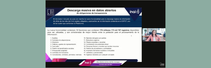 En el marco de este evento, se realizó la conferencia magistral “Transparencia, derecho a Saber y Tecnologías para su Ejercicio”, impartida por Norma Julieta del Río Venegas, Comisionada del INAI; además se presentó el ABC del Uso de la Plataforma Nacional de Transparencia, dictada por Luis Fernando Araíz Morales, Director General de Tecnologías de la Información y Sergio Octavio Contreras Padilla, Director de Promoción, ambos del INAI.