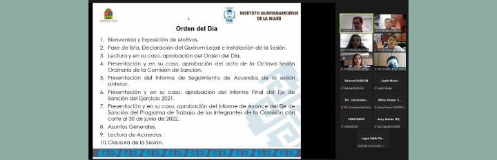 En esta sesión, las y los participantes aprobaron el acta de la Octava Sesión Ordinaria de la Comisión de Sanción, presentaron el Informe de Seguimiento de Acuerdos de la sesión anterior, aprobaron el Informe Final del Eje de Sanción del Ejercicio 2021 y el Informe de Avances del Eje de Sanción del Programa de Trabajo de los Integrantes de la Comisión con corte al 30 de junio de 2022.