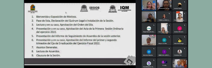 En esta reunión, se aprobó el Acta de la Primer Sesión y se presentaron el Informe de Seguimiento de Acuerdos de la sesión anterior y el Informe del primer y segundo trimestre del Eje de Erradicación del Ejercicio Fiscal 2022.