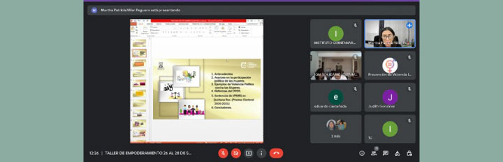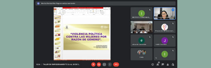 Chetumal, Quintana Roo a 27 de septiembre de 2022.- La Jefa del Área de Capacitación del Tribunal Electoral de Quintana Roo, Martha Patricia Villar Peguero, impartió la conferencia virtual “Violencia Política contra las Mujeres en Razón de Género” dentro del marco del Taller de Empoderamiento y Liderazgo para las Mujeres, organizado por el Instituto Quintanarroense de la Mujer (IQM).