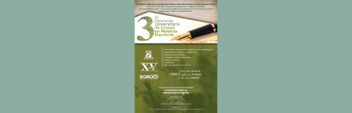 Chetumal, Q. Roo a 12 de septiembre de 2018.- El Tribunal Electoral de Quintana Roo y el Instituto Electoral de Quintana Roo convocan a los universitarios de la entidad a participar en el Tercer Concurso Universitario de Ensayo en Materia Electoral.