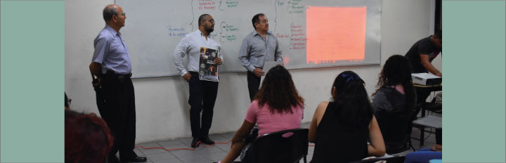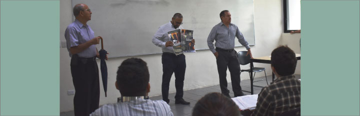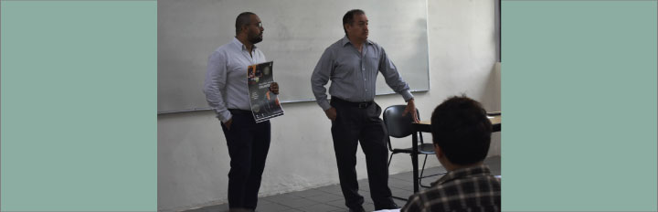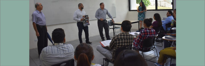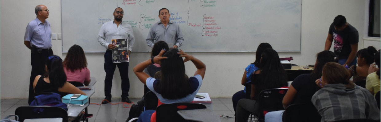 oEl jefe de la Unidad de Legislación y Jurisprudencia, Eliseo Briceño Ruiz y Roberto Delfín Zamudio, jefe del Área de Documentación visitaron estudiantes de 2º, 4º, 6º y 8º semestre de la Licenciatura de Derecho para invitarlos a consultar la Biblioteca del TEQROO.