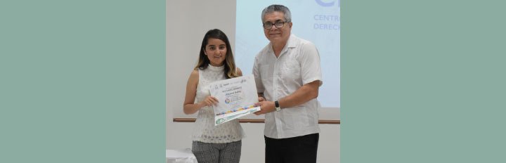 La Maestra Rebeca Herreros Tapia, Secretaria Ejecutiva de la Comisión de Derechos Humanos de Quintana Roo fue la encargada de entregar el reconocimiento al ponente Edson González Espino, mientras que Kariana Rubio lo recibió de manos de Carlos José Caraveo Gómez, Jefe de la Unidad de Capacitación e Investigación del TEQROO.