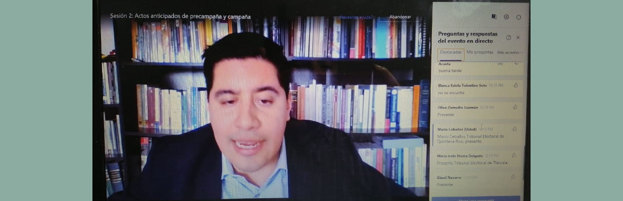 Chetumal, Q. Roo a 19 de mayo de 2020.- Personal jurídico del Tribunal Electoral de Quintana Roo continúa cursando el Seminario en línea sobre el Procedimiento Especial Sancionador que imparte el Magistrado de la Sala Superior del Tribunal Electoral del Poder Judicial de la Federación, Reyes Rodríguez Mondragón en colaboración con la Asociación de Tribunales Electorales de la República Mexicana, por lo que hoy correspondió el tema “Actos anticipados de campaña”.