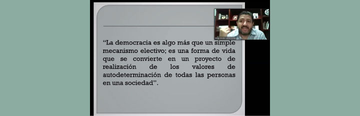 Insistió en que, la democracia es una forma de gobierno del Estado, donde el poder es ejercido por el pueblo, mediante mecanismos legítimos de participación en la toma de decisiones políticas; donde el mecanismo fundamental de participación de la ciudadanía es el sufragio, a través del cual la ciudadanía elige a sus dirigentes o representantes para un período determinado.