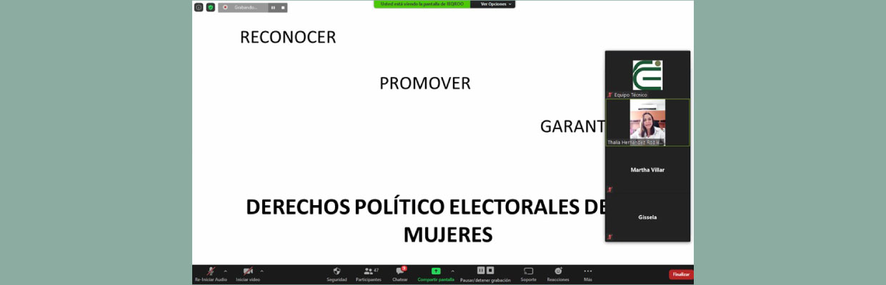 Chetumal, Quintana Roo a 30 de junio de 2020.- El Tribunal Electoral de Quintana Roo ofreció una conferencia virtual a servidores públicos de la Secretaría de Desarrollo Agropecuario y Pesca sobre “Mujeres en la lucha por la igualdad política” a cargo de la Consejera del Instituto Electoral de Quintana Roo, Thalía Hernández Robledo, ponente invitada de este órgano jurisdiccional.
