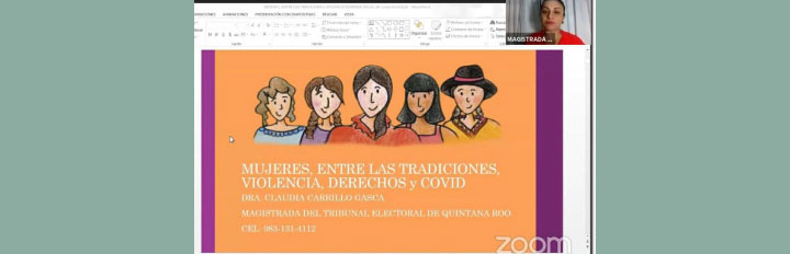 Chetumal, Quintana Roo a 25 de agosto de 2020.- La Magistrada Claudia Carrillo Gasca ofreció en el marco del Día Naranja la conferencia virtual “Retos: Eliminación de los motivos de discriminación contra las mujeres” a invitación de la Diputada de la XVI Legislatura, Teresa Atenea Gómez Ricalde, presidenta de la Comisión para la Igualdad de Género.