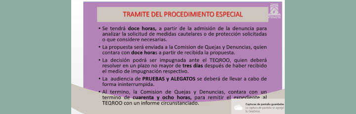 Respecto a las medidas cautelares o de protección, la Magistrada Carrillo Gasca dijo que la ley establece que la dirección jurídica las analizará y elaborará una propuesta a la Comisión de Queja y Denuncias, quién en 12 horas emitirá el acuerdo correspondiente. Y al finalizar esta etapa, la misma comisión dentro del término de 48 horas remitirá el expediente completo con un informe circunstanciado al Tribunal Electoral de Quintana Roo para que emita la resolución correspondiente.