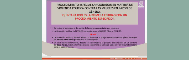 Dijo que está nueva normatividad será aplicable en el Proceso Electoral Local Ordinario de 2021, por lo que se incluyó en la ley un nuevo procedimiento: El Procedimiento Especial Sancionador en Materia de Violencia Política contras las Mujeres en Razón de Género, medio de impugnación a través del cual el Tribunal Electoral de Quintana Roo podrá conocer y resolver este tipo de quejas.
