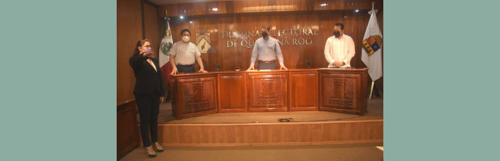Chetumal, Quintana Roo a 01 de febrero de 2021.- El Magistrado Presidente del Tribunal Electoral de Quintana Roo, Víctor Vivas Vivas y el Magistrado Sergio Avilés Demeneghi presidieron la toma de protesta del Titular del Órgano Interno de Control, Jorge Francisco Martínez Rendón y de tres servidoras electorales, en el Salón de Plenos de este órgano jurisdiccional.