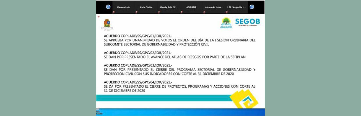En esta reunión, se presentó el avance del Atlas de Riesgo por parte de la Secretaría de Finanzas y Planeación, el cierre del Programa Sectorial de Gobernabilidad y Protección Civil con sus indicadores con corte al 31 de diciembre de 2020 y el cierre de Proyectos, Programas y acciones con corte al 31 de diciembre de 2020.