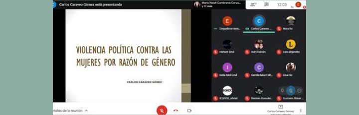 Chetumal, Quintana Roo a 27 de abril de 2021.- El Jefe de la Unidad de Capacitación e Investigación del Tribunal Electoral de Quintana Roo (TEQROO), Carlos José Caraveo Gómez impartió la conferencia virtual “Violencia Política contra las Mujeres por Razón de Género” dentro del marco del Taller de Empoderamiento y Liderazgo para las Mujeres, organizado por el Instituto Quintanarroense de la Mujer (IQM), en el que participaron 32 personas.