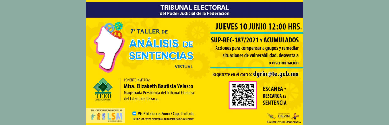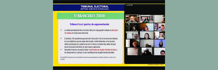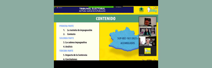 En esta ocasión, la ponente invitada fue la Magistrada Presidenta del Tribunal Electoral del Estado de Oaxaca, Elizabeth Bautista Velasco, quien hablo del alcance de la sentencia emitida por la Sala Superior del TEPJF en los expedientes SUP-REC-187/2021 y acumulados, en las que resolvió sobre “Acciones para compensar a grupos y remediar situaciones de vulnerabilidad, desventaja o discriminación”.