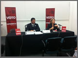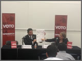 El Magistrado Víctor Venamir Vivas Vivas, auxiliado por la Consejera Macarita Elizondo Gasperín, muestra a los asistentes a la presentación del libro “Un Voto Marca la Diferencia”, la copia ampliada de la boleta electoral que permitió ganar una curul en la XIII Legislatura a un candidato a Diputado.