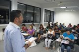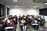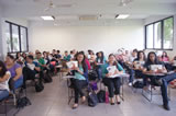 Los alumnos de la carrera de Derecho de la UQROO muestran los materiales impresos recibidos.