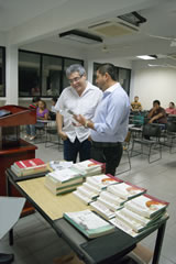 El Magistrado Presidente Víctor Venamir Vivas Vivas señala al Maestro de la carrera de Derecho Caraveo Gómez los materiales que entregará a los alumnos como apoyo a los estudios que desarrollan.