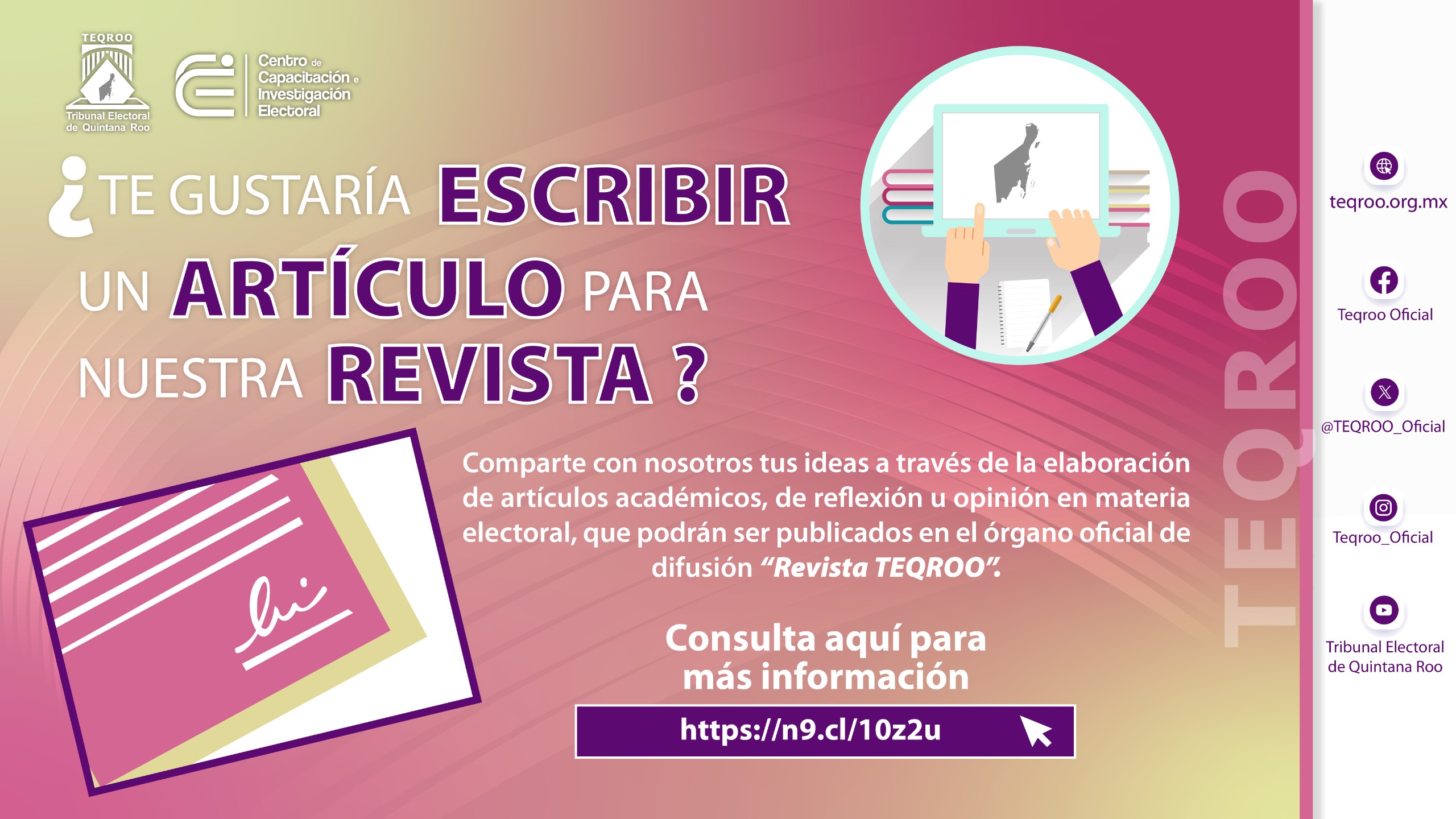 Es por ello que, el Tribunal Electoral de Quintana Roo (TEQROO) en términos de los artículos 220 fracción V de la Ley de Instituciones y Procedimientos Electorales para el Estado de Quintana Roo (LIPEQROO) extiende una cordial invitación a partidos políticos, organizaciones de la sociedad civil, juventudes, academia y público en general para participar en el órgano oficial de difusión de este órgano jurisdiccional (Tribunal “Revista TEQROO”), mediante un artículo académico (investigación), de reflexión u opinión inédito en materia electoral.