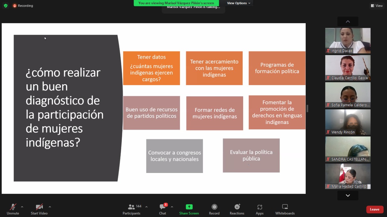 Chetumal, Quintana Roo a 17 de octubre de 2022.- La Magistrada del Tribunal Electoral de Quintana Roo (TEQROO), Claudia Carrillo Gasca participó como ponente en el “Foro Retos y Avances de la Participación Política de las Mujeres”, que organizó de manera virtual la Directora General del Instituto Quintanarroense de la Mujer (IQM), María Hadad Castillo.