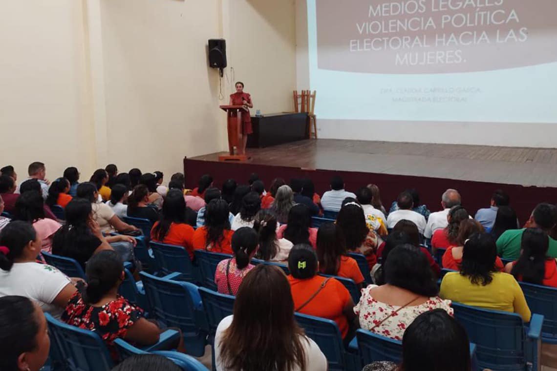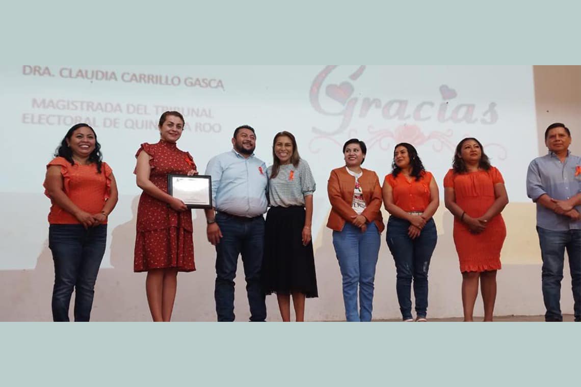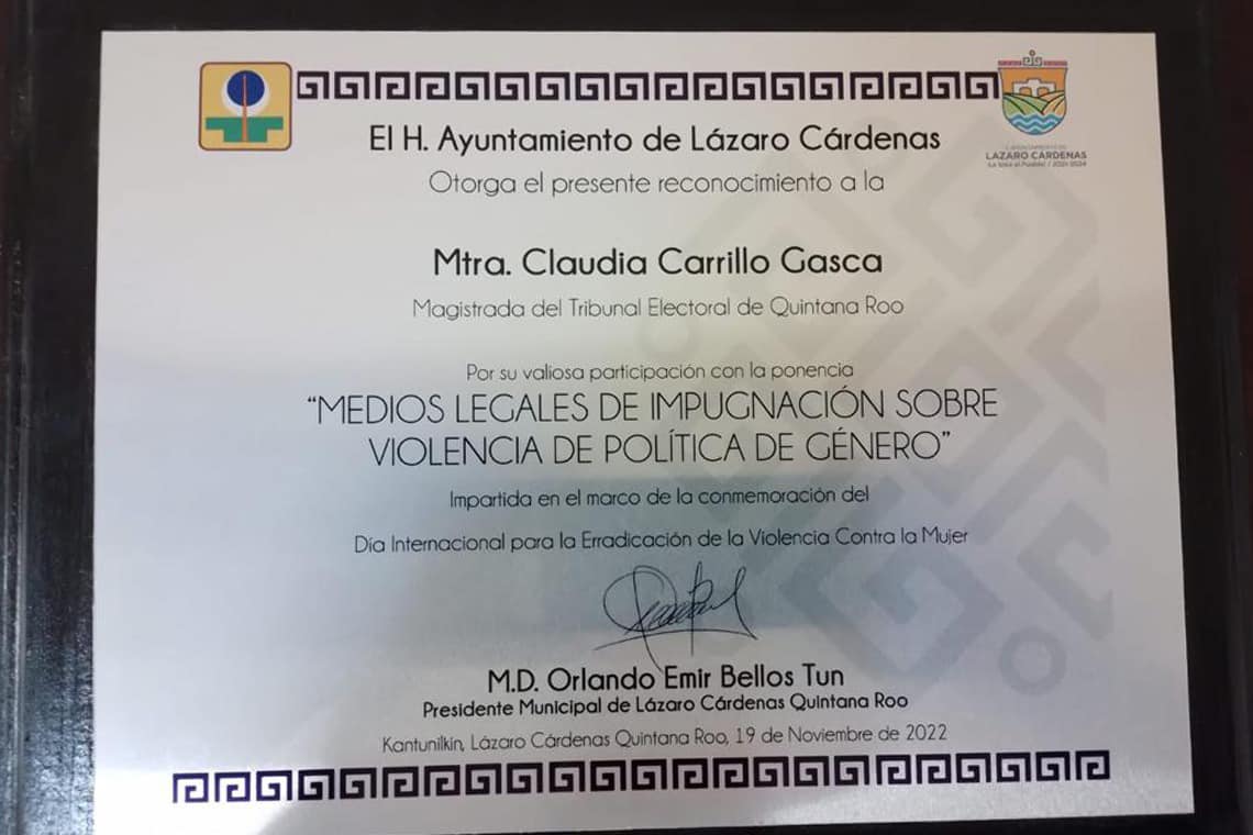 Chetumal, Quintana Roo a 19 de noviembre de 2022.- La Magistrada del Tribunal Electoral de Quintana Roo, Claudia Carrillo Gasca ofreció la conferencia “Medios Legales de Impugnación sobre Violencia Política de Género”, a invitación del Presidente Municipal de Lázaro Cárdenas, Orlando Emir Bellos Tun.