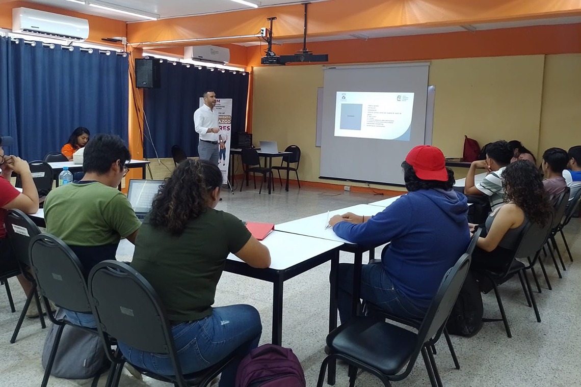 El jefe de Área de Investigación de la Unidad de Capacitación, Eliud de la Torre Villanueva, fue el encargado de exponer ante la comunidad estudiantil el tema de VPCMRG con la finalidad de que identifiquen y conozcan el concepto de violencia política contra las mujeres en razón de género, así como el marco jurídico nacional y local vigente en la materia para prevenir, erradicar, sancionar y reparar integralmente esta conducta violatoria a derechos humanos de las mujeres.