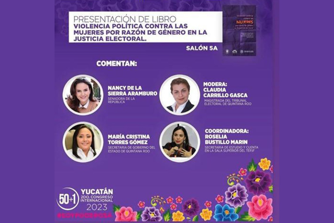 Mérida, Yucatán a 01 de julio de 2023.- La Magistrada del Tribunal Electoral de Quintana Roo (TEQROO), Claudia Carrillo Gasca participó en la presentación del libro “Violencia Política contras las Mujeres por Razón de Género en la Justicia Electoral”, en el marco del 2do. Congreso Internacional Colectivas 50+1, realizado este 30 de junio y 1º de julio en el Centro Internacional de Convenciones de la Ciudad de Mérida.