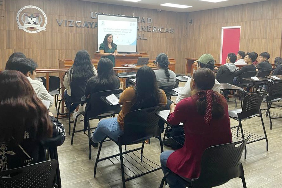 Chetumal, Quintana Roo a 29 de noviembre de 2023.- El Tribunal Electoral de Quintana Roo (TEQROO) a través de la Unidad de Capacitación e Investigación impartió la plática “Los derechos político-electorales de las mujeres desde un enfoque transversal de los derechos humanos”, ante estudiantado de la Universidad Vizcaya de las Américas.